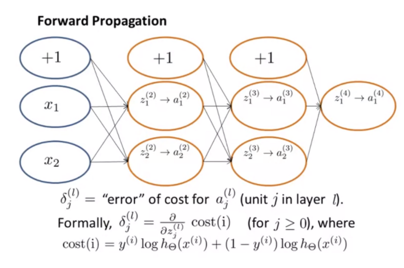 delta j ^l 은 a j ^l의 오차라는 사실을 기억해야 합니다. 결국 오차는 비용 함수 cost(i)를 미분한 것과 같습니다. 역전파는 순전파처럼 오차항이 퍼져나가는 방식으로 전개할 수 있습니다.