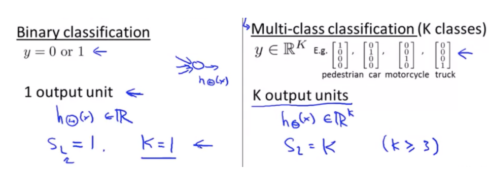Multi-class classification 이라면 가설의 출력은 클래스의 숫자와 동일합니다. 클래스의 수가 K 라면 출력 유닛의 숫자도 K입니다. 이 경우 가설은 R^K차원 벡터입니다. 출력1 = [1;0;0;0] , 출력2 = [0;1;0;0] ...
