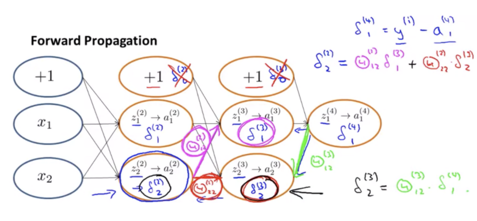 delta j ^l 은 l층의 j번 유닛의 오차를 표기하는 방법입니다. 출력층의 오차부터 계산해봅시다. delta j ^4 의 오차는 a j^4 - y j 일 것입니다. (가설과 실제 결과의 차이) 그 다음 3층의 오차를 계산해봅니다. delta^3(3층 오차들의 벡터) 는 theta^3T * delta^4.*g'(z^3)과 같습니다. 이것이 오차항을 계산하는 결과입니다. g'(z^3)는 시그모이드 함수를 미분한다는 뜻이고 결과는 a^3.*(1-a^(3))이 됩니다. 이 결과를 반복하여 2층의 오차도 구합니다. 단 1층은 입력 층이므로 오차가 존재하지 않으니 구하지 않습니다.