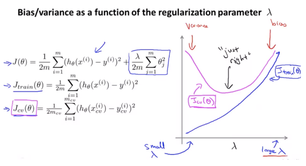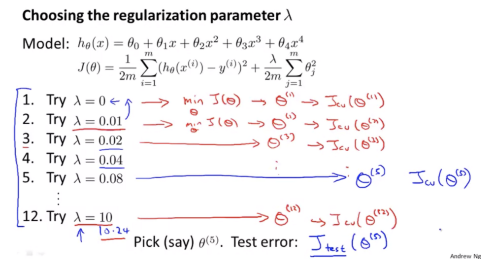 여러가지 람다값을 넣어 J를 최소화하고 그렇게 도출된 파라미터를 교차 검증 셋에서 확인하여 오류를 얻습니다. 교차 검증 셋에서 가장 낮은 오류를 낸 파라미터를 선택하고 테스트 셋에서 잘 작동하는지 확인합니다.