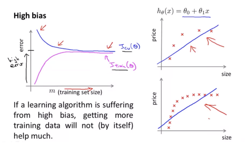 만약 알고리즘의 편항이 심하다면 Jtrain과 Jcv의 오차가 둘다 상대적으로 높을 것이고 차이가 크지 않을 것입니다. 편향이면 과소적합 상태일텐데 아무리 데이터 셋을 추가로 넣어도 오차는 줄어들지 않을 것 입니다.