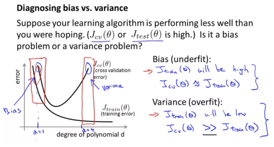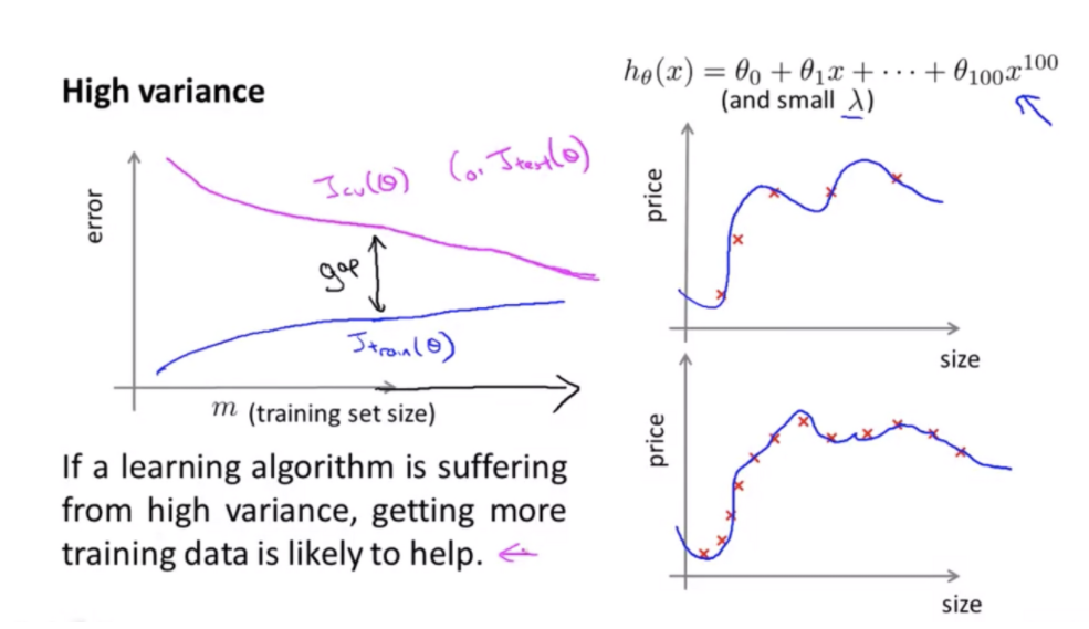 반대로 높은 분산이라면 Jtrain과 Jcv사이의 차이가 상대적으로 큽니다. 이런 경우에는 데이터 셋을 더 추가하는 것이 도움이 됩니다.