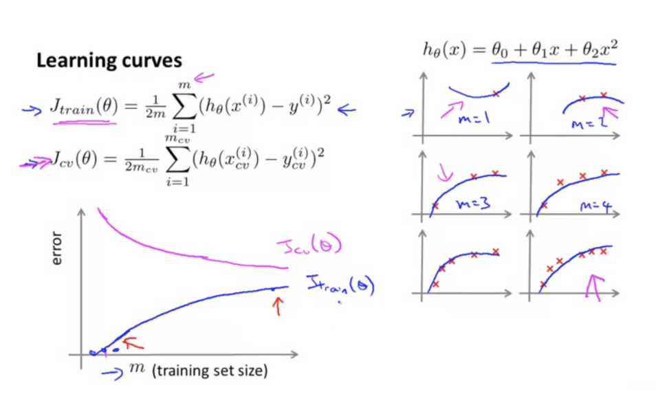 트레이닝 셋의 경우 데이터 셋의 숫자가 클 수록 오차가 커집니다. 왜냐하면 모든 데이터 셋에 딱 들어맞는 가설을 찾는 것이 점점 어려워지기 때문입니다. 교차 검증 셋의 경우 트레이닝 셋과 다른 새로운 데이터 셋에 대한 오차를 구하기 때문에 처음엔 오차가 컸다가 데이터 셋이 증가할수록 오차도 작아지게 됩니다.