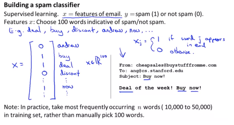 스팸 메일을 분류하는 모델을 만든다고 가정합시다. 어떤 방법으로 접근하면 효율적일까요? 스팸 메일들을 수집하고 그 데이터를 바탕으로 스팸이면 y=1 , 스팸이 아니면 y=0 인 식으로 분류할 수 있을 것 같습니다. 스팸에서 사용되는 단어들을 변수 x로 둘 수 있을 것 같습니다. 예를 들어 deal 이라는 단어가 있으면 스팸일 수 있습니다. 거기에 coin이나 free같은 단어들이 같이 있다면 더 확률이 높아질 것 입니다. 이렇게 추정 가능한 단어 수백 개를 변수로 지정합니다. 반면 제 이름이 쓰여있다면 상대적으로 스팸일 가능성은 낮아지겠지요.