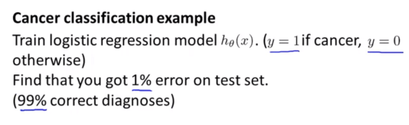 암 분류 문제에 대해 로지스틱 회귀를 학습시킨 결과가 1%의 오류라고 합시다. 그렇다면 99% 정확한 진단을 내린다는 것 입니다. 하지만 실제로는 0.5%의 환자만이 암에 걸렸습니다. 선별된 환자 중 절반은 정상이고 절반은 암 환자입니다. 그렇다면 1% 오류는 설득력이 없습니다. 변수의 값과 상관없이 무조건 y=0으로 예측하는 단순한 코드가 있다고 칩시다. 이 경우의 오류는 0.5%로 우리의 로지스틱 회귀보다 오류율이 낮습니다. 한쪽으로 치우친 클래스는 positive와 negative가 한쪽으로 매우 편향된 예제입니다. 단지 모든 변수에 대해 y=1 or y=0으로 예측해도 좋은 결과를 얻습니다. 이런 경우 정확도만 따지는 것은 위험합니다.