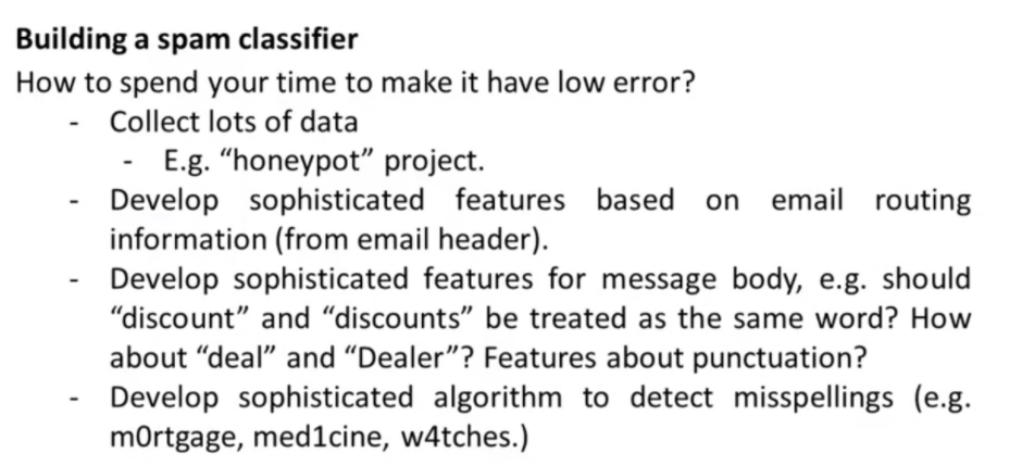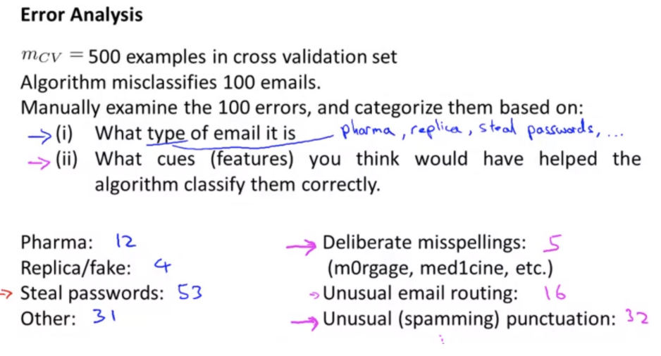 예를 들어 봅시다. 500개의 교차 검증 셋에서 100개의 메일이 잘못 분류되었습니다. 이 잘못 분류된 메일들을 직접 조사해보고 분류합니다. 크게 4가지 유형으로 약 판매에 관한 메일이 12개, 가짜 제품 판매가 4개 , 비밀 번호를 훔치려는 피싱이 53건, 기타가 31건입니다. 알고리즘에 피싱에 가장 취약하므로 피싱을 분석해 봅니다. 고의 스펠링 변경은 5건, 16건의 비정상 이메일 라우팅, 32건의 비정상 마침표입니다. 비정상 마침표가 가장 많은 건수를 차지하므로 우선적으로 이 문제를 해결하는데 집중합니다.
