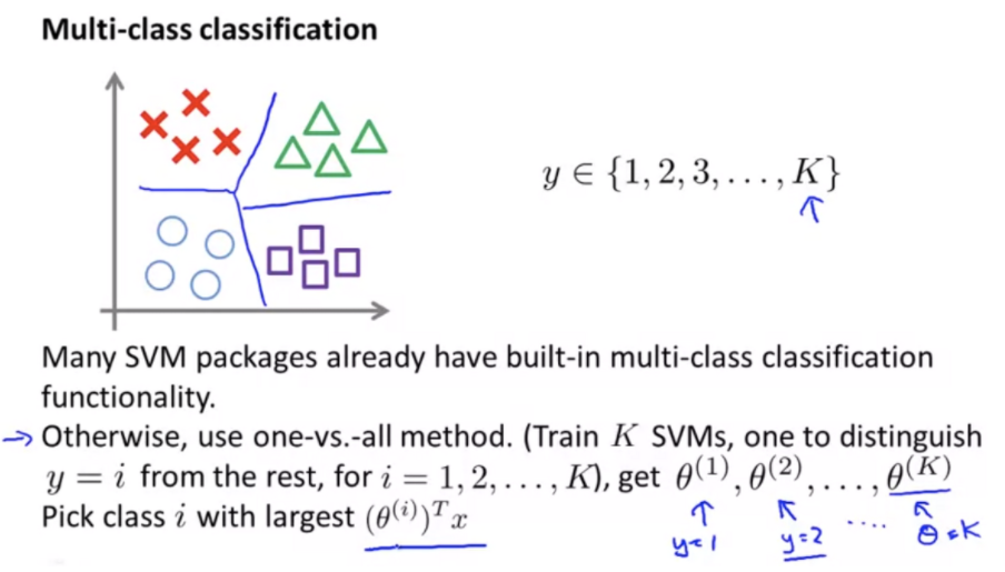 멀티 클래스 분류에서 SVM을 사용하는 경우입니다. 클래스가 K개라면 K개의 SVM을 학습하여 다른 클래스와 구분합니다. 로지스틱 회귀에서와 동일한 방법입니다.