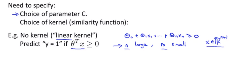 커널을 사용하지 않는다는 것은 선형 커널을 사용한다는 것을 의미합니다. 변수의 수가 많고 데이터 셋의 크기 m이 작을 때는 유용할 수 있습니다.