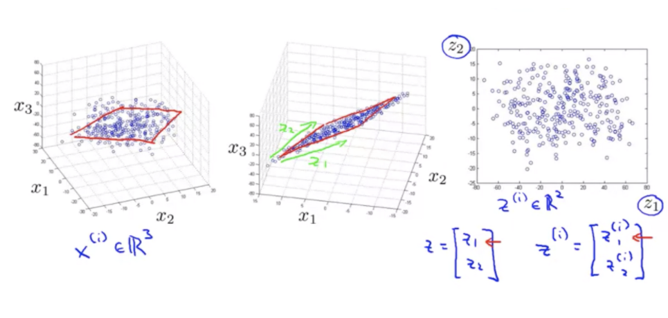 보통 1000개의 변수를 100개로 줄이는 것 처럼 큰 스케일의 작업을 주로 하지만 이해를 위해 3차원 데이터 셋을 2차원으로 축소해보겠습니다. 3차원 데이터 셋에서는 어떤 2차원 평면에 데이터들을 투영할 수 있습니다. 그렇다면 변환된 데이터 z는 z1 z2로 이루어진 벡터일 것 입니다. 변환된 2D 데이터는 우측 z1 z2 분산도와 같습니다.