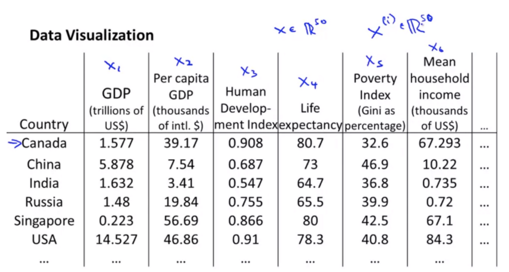 위와 같은 국가별 경제 지표 통계 데이터가 있다고 합시다. 변수가 50개라면 데이터의 차원은 50차원입니다. 시각화는 데이터를 이해하는 효율적인 방법 중 하나이지만 50차원을 도식화 할 수는 없습니다. 따라서 50차원을 2차원으로 축소시켜 표시해보겠습니다.