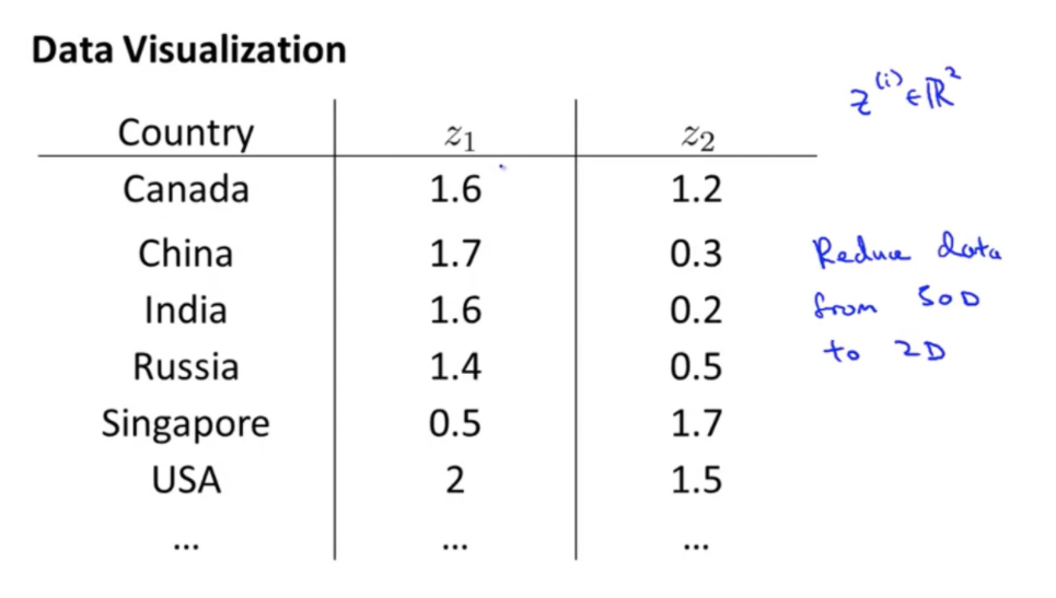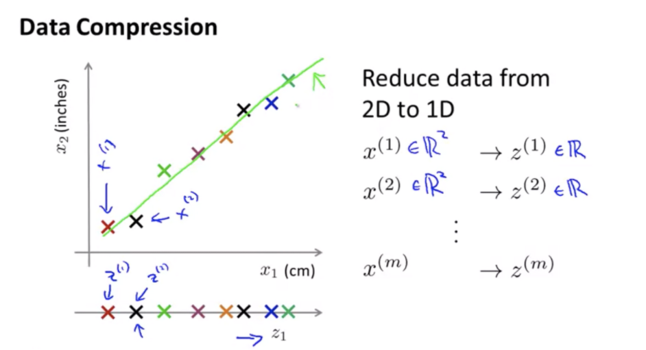 두 개의 변수 x1 ,x2가 있습니다. x1은 cm 단위이고 x2는 inch 단위입니다. 똑같이 물체의 길이에 대한 변수이지만 단위만 다릅니다. 따라서 2차원이 아닌 1차원으로 줄이는 것이 더 효율적입니다. 중복되는 변수가 발생하는 일은 흔한 일입니다. 이제 데이터들을 녹색 직선에 투영하고 이를 z1으로 부릅니다. x^(m) 은 z(m)으로 치환 가능합니다. 이렇게 차원 축소를 실행하면 메모리를 아끼고 알고리즘의 속도도 올릴 수 있습니다.