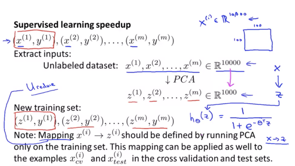비전 문제를 풀 때 변수가 너무 많기 때문에 PCA를 적용하면 유리합니다. 주의할 점은 PCA는 학습 셋에서만 적용되어야 한다는 점 입니다. Ureduce는 학습 셋에서 PCA를 사용한 결과이기 때문입니다.