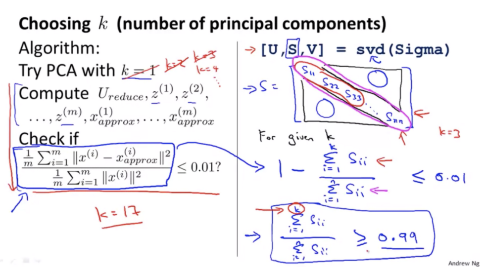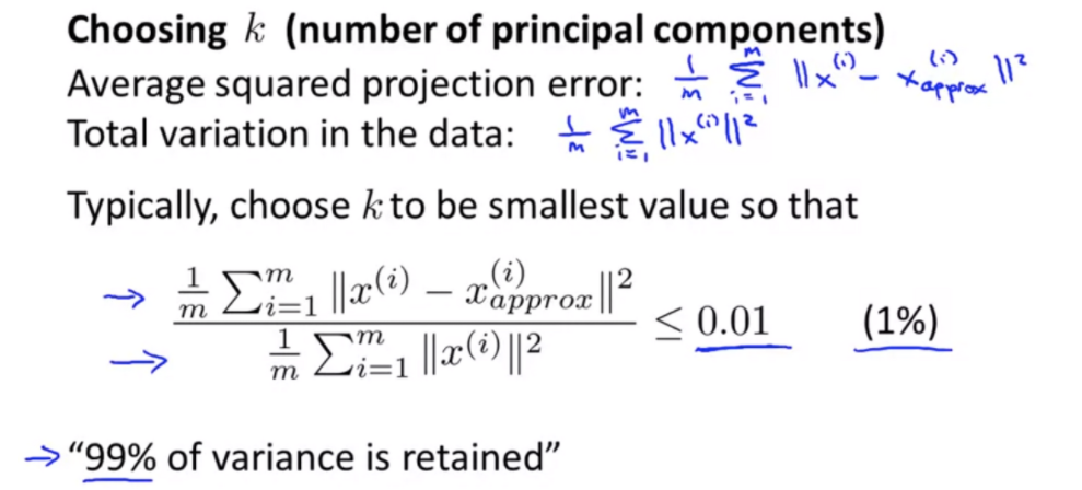각 데이터 셋의 원점으로부터의 거리의 평균 분의 투영 오차의 평균을 나눈 값이 0.01 이하가 되도록 설정합니다. PCA에서 이 뜻은 99%의 분산을 유지한다는 뜻입니다. 이 분산을 유지하는 최소의 k를 선택합니다.