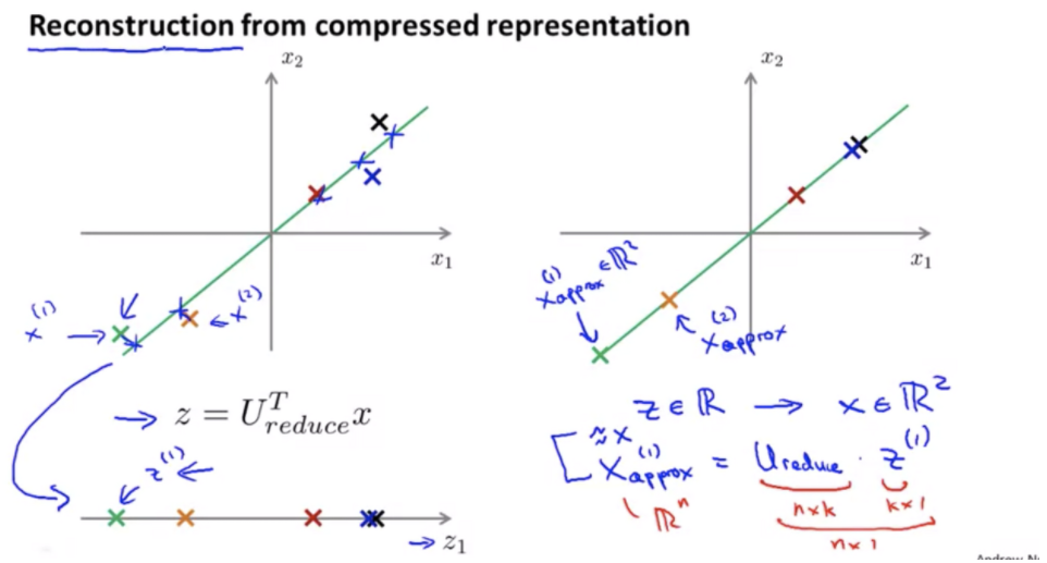 차원 축소한 데이터를 다시 원본으로 돌릴 수 있을까요?? Z= UreduceT * X 로 데이터를 변환했었습니다. 따라서 X = Ureduce * Z 를 하면 구할 수 있고 원본 X의 근사값이 됩니다. 이를 재구성(Reconstruction) 이라고 합니다.