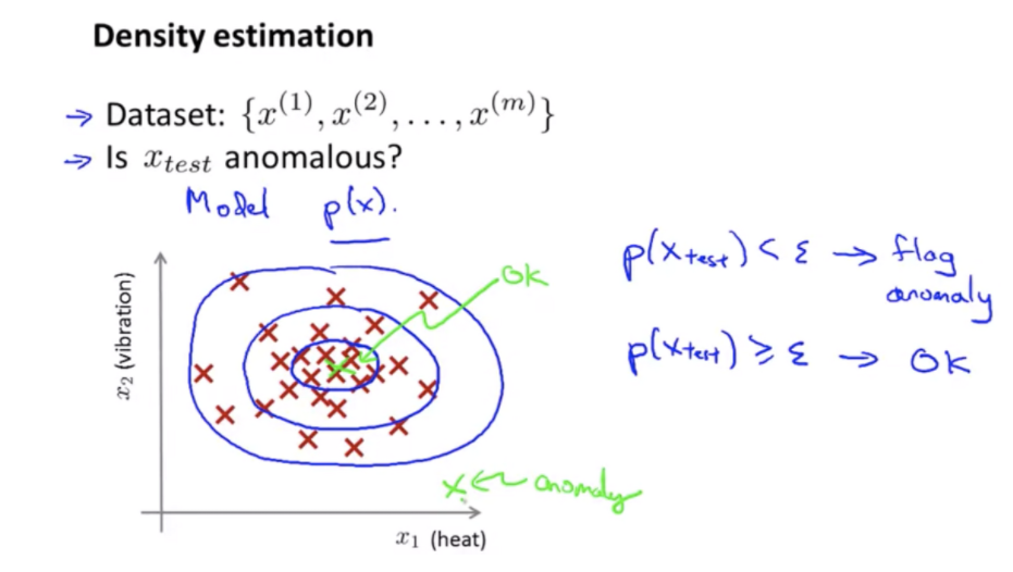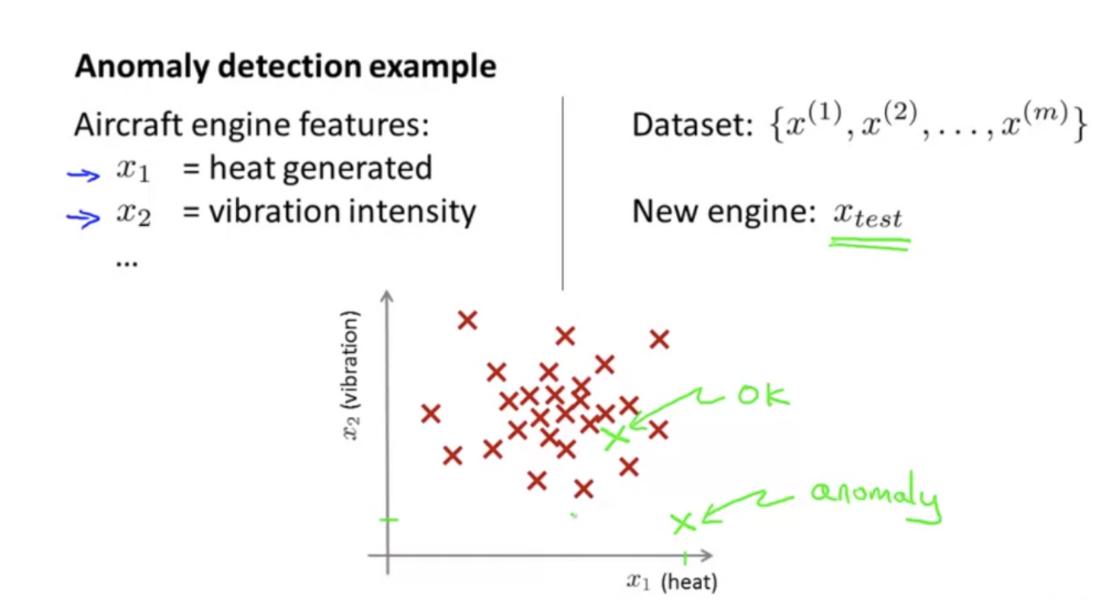 항공기의 엔진을 제조한다고 생각해봅시다. 품질 보증 단계에서 테스트를 진행합니다. 엔진의 발열이나 진동같은 변수들을 측정합니다. 이상 탐지 문제는 엔진이 정상인지 비정상인지 탐지하는 것이 목적입니다. 녹색 데이터는 xtest로 새로운 데이터 셋입니다. 만약 다른 엔진들과 비슷한 위치에 있다면 문제가 없다고 생각해도 괜찮습니다. 반면에 xtest가 다른 엔진들과 멀리 떨어져 있다면 비정상입니다.