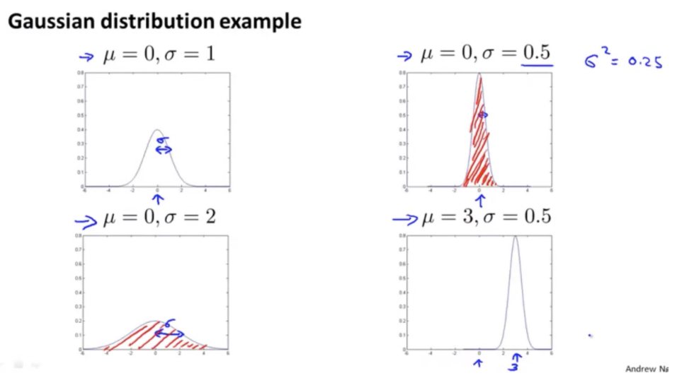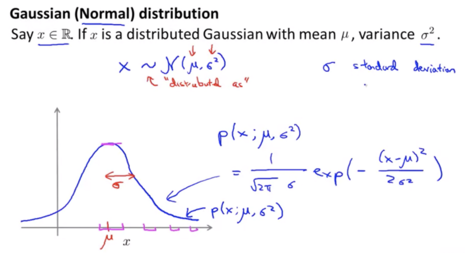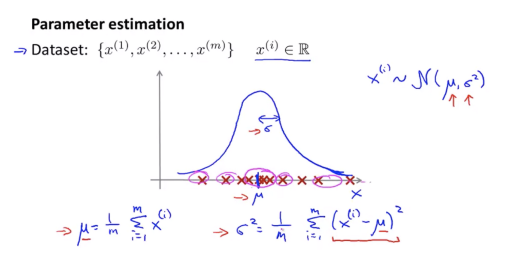 데이터 셋은 m개이고 n은 변수의 개수입니다. 각 변수별 확률 p(x)를 구합니다. p(x1),p(x2),p(x3)....p(xn). 모든 변수에 대한 확률을 구하고 곱합니다. 그 후 새로운 테스트 데이터가 비정상인지 확인하기 위해서 의심되는 변수 하나를 선택합니다. 값이 비정상적으로 크거나 작아서 비교할 수 있는 변수가 좋습니다. 그 다음 가우시안 파라미터의 값들을 최적화합니다. μ와 σ^2를 구합니다. 마지막으로 , 새로운 예제에 대한 확률 p(x)를 계산하여 엡실론과 비교합니다. 정상인지 비정상인지 판단합니다.
