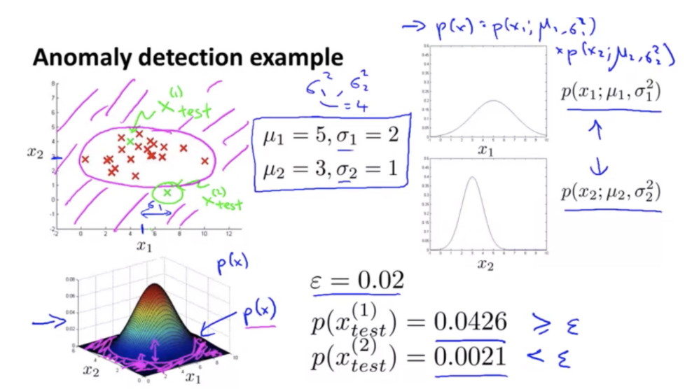 알고리즘을 적용한 예시입니다. x1에 대한 가우시안 파라미터 , x2에 대한 가우시안 파라미터를 모두 구했습니다. p(x1), p(x2) 가우시안 분포 그래프도 그릴 수 있습니다. 이 두 값을 곱한 p(x) 가 우하단의 3d 그래프입니다. 그래프의 높이가 확률을 의미합니다. 새로운 예제 x1test와 x2test에 대한 이상 탐지를 실행하고 싶습니다. 일단 엡실론은 0.02로 설정했다고 가정합니다. p(x1test)와 p(x2test)를 구하여 엡실론과 비교해봅니다. p(x1test)의 경우 엡실론보다 큰 0.0426이고 다른 예제들과 근접하여 정상일 확률이 높습니다. p(x2test)는 엡실론보다 작은 0.0021이고 다른 예제들과 떨어져 있어서 비정상일 확률이 높습니다.