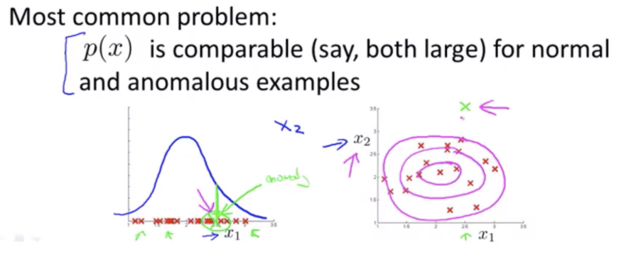 녹색 예제는 비정상 예제이지만 x1의 그래프에서 꽤 높은 확률이므로 비정상으로 분류하지 않습니다. 따라서 이 예제를 이상 예제로 검출하기 위한 새로운 변수가 필요합니다. x2를 새롭게 설계하고 도식화합니다. 이제 녹색 예제는 x1에서는 정상 범위이지만 x2에서는 비정상이므로 이상 예제로 분류됩니다. 이렇게 새로운 변수를 찾습니다.