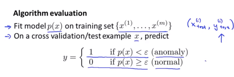 알고리즘을 개발하고 평가하는 방법에 대해 알아봅니다. 첫번째로 학습 셋을 사용하여 p(x) 모델을 구합니다. 두번째로 테스트 셋과 교차 검증 셋에서 예측합니다. p(x)가 엡실론보다 작으면 비정상 , 크면 정상으로 생각합니다.