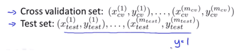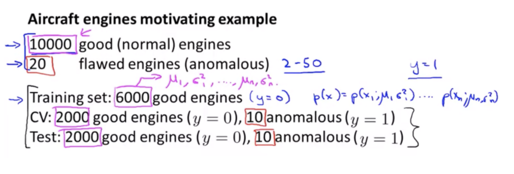 구체적으로, 10000개의 정상 예제, 20개의 비정상 예제가 있다고 합시다. 그렇다면 6000개의 학습 셋, 2000개의 교차 검증 셋, 2000개의 테스트 셋으로 분리할 수 있습니다. 결함이 있는 비정상 예제는 각각 10개 씩 교차 검증 셋과 테스트 셋에 부여합니다.