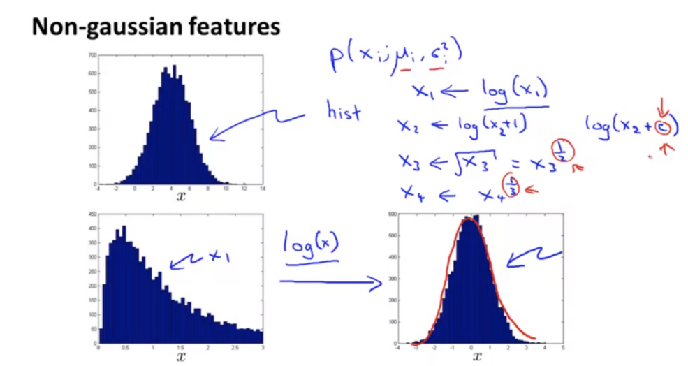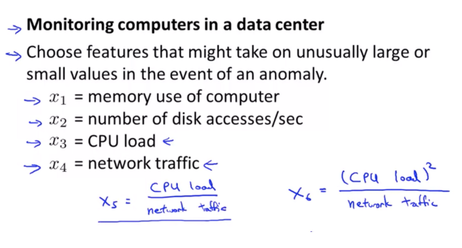 데이터 센터를 모니터링하는 예제입니다. 서버가 잘 작동하는지 확인하기 위해 여러 가지 변수를 사용합니다. 일반적으로 사용자가 많다면 웹서버는 cpu부하와 네트워크 트래픽 사용량이 둘 다 높습니다. 만약 무한 루프에 갇혀서 성능이 제대로 나오지 않은 이상 현상이 발생한다면 네트워크 트래픽은 그대로지만 cpu 부하는 계속 증가하게 됩니다. 이 이상을 감지하기 위해 새로운 변수를 설계합니다. x5 = cpu load / 네트워크 트래픽으로 무한 루프가 발생한다면 x5는 매우 큰 값을 가지게 되어 문제를 탐지하는데 도움이 됩니다.