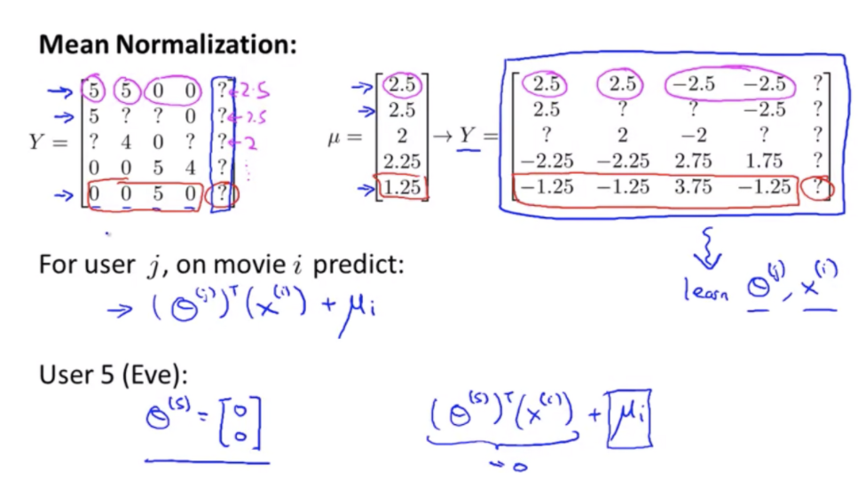 이 문제를 해결하기 위해 Normalization 개념을 도입합니다. 모든 영화 등급을 행렬 Y로 그룹화합니다. 이브는 어떤 영화도 평가하지 않았기 때문에 5번째 열의 성분들은 물음표입니다. 이제 각 영화가 받은 영화 등급의 평균을 계산합니다. 첫번째 영화는 5,5,0,0을 받았으므로 10/4 = 2.5가 평균 점수가 됩니다. 이렇게 구한 평균 벡터를 μ 벡터로 합니다. Y의 모든 열에 μ 벡터를 뺍니다. 결과적으로 Y의 각 행들의 평균은 0이 됩니다. 변형시킨 Y를 협업 필터링 알고리즘에 적용합니다. 이 때 아까 빼준 평균값 만큼 다시 더해줍니다. 이브가 준 별점의 초기값들은 모두 0이지만 이제 평균을 더하여 어떤 값을 줄 수 있습니다. 이브는 아직 어떤 평가도 하지 않았기 때문에 다른 유저들이 준 영화의 평균값이 별점이 될 것이라고 추정합니다.