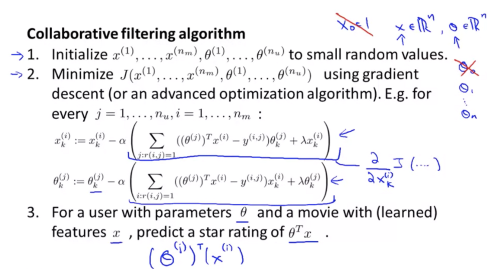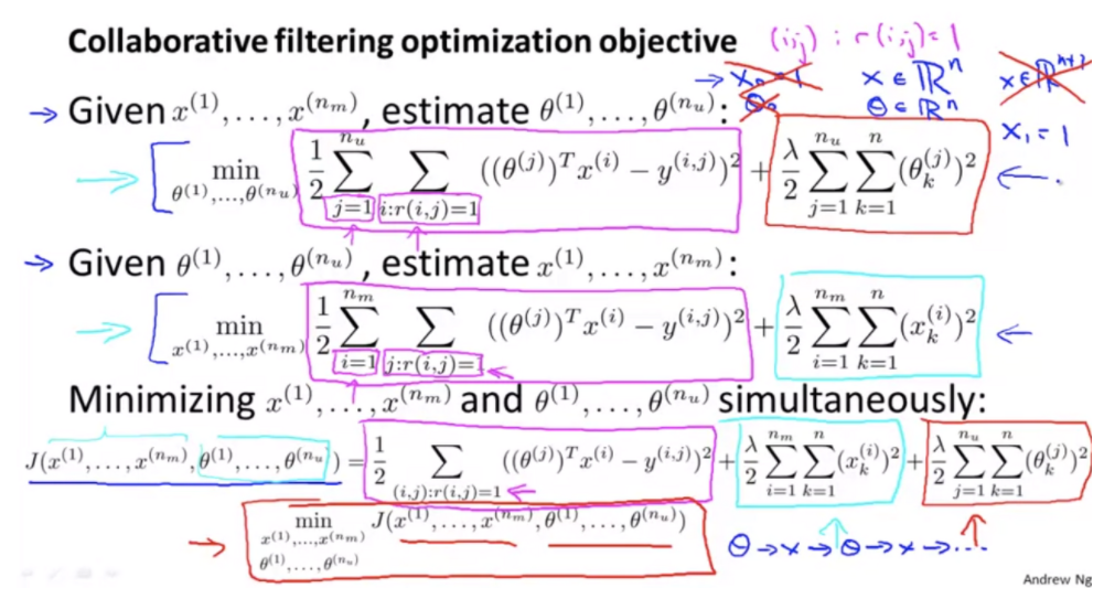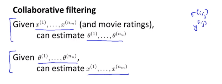 영화에 관한 변수인 x가 주어졌다면 파라미터 theta를 유추할 수 있습니다(컨텐츠 기반 추천). 각 유저들의 선호도인 파라미터 theta가 주어졌다면 x를 유추할 수 있습니다(협업 필터링).