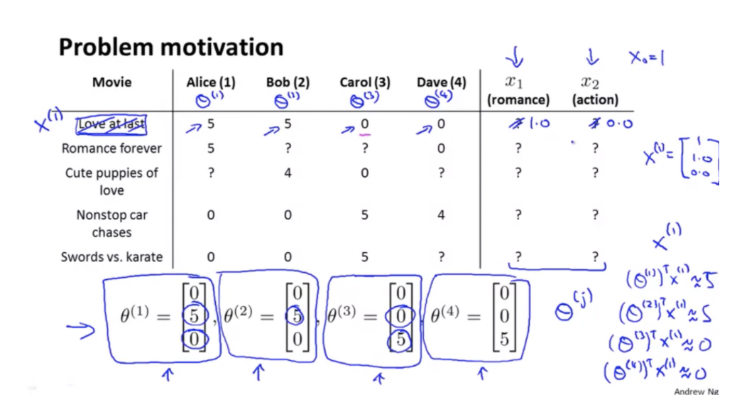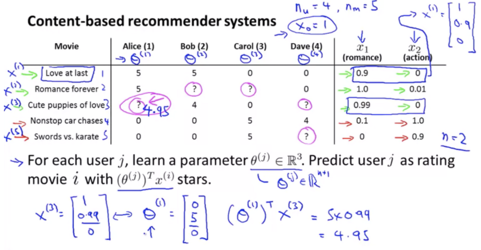 우리의 목표는 ?의 값을 예측하는 것 입니다. 이를 위해 영화의 특성을 나타내는 변수들을 만듭니다. x1는 영화의 로맨스 정도이고 x2는 액션의 정도입니다. 즉 영화가 로맨스에 가까울 수록 x1의 값은 커지고, x2의 값은 작아집니다. 반대로 영화가 액션에 가깝다면 x2의 값이 커지고 x1은 작아집니다. 5개에 영화에 대해 변수 벡터로 표현합니다. x(1) = [1;0.9;0], x(2) = [1;1;0.01] 같은 형식입니다. 이제 각 유저에 대한 파라미터 theta를 학습해야 합니다. 앨리스는 로맨스 영화를 극도로 선호하는 특성이 있으므로 theta(1) = [0; 5; 0] 으로 표현할 수 있습니다. x(3) = [1;0.99;0]으로 표현 가능하므로 우리는 cute puppies of love에 대한 앨리스의 점수를 theta(1)^T * x(3)으로 계산하여 4.95 정도가 될 것이라고 예측할 수 있습니다.