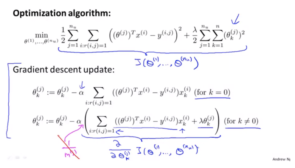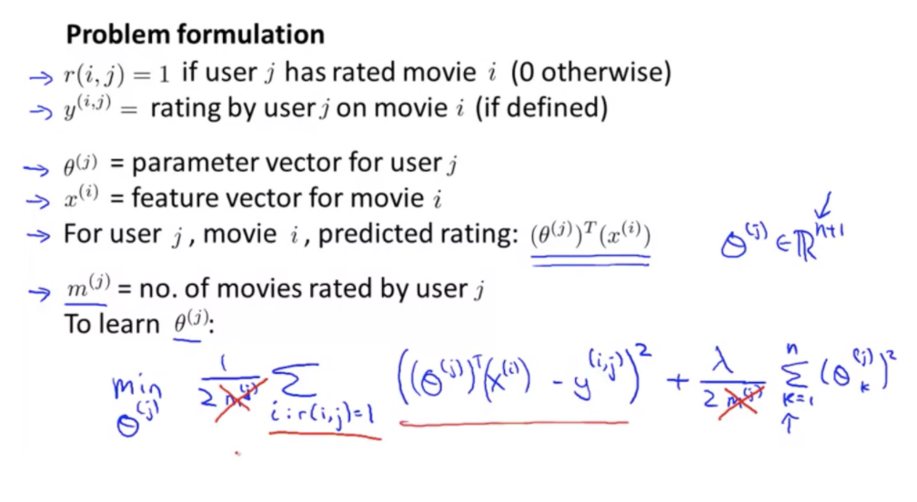 파라미터 벡터 theta는 각 유저들에 대한 파라미터입니다. 이를 계산하기 위해 , 해당 유저가 실제로 별점을 준 값과 예측 값 사이의 오차로 cost function을 만들고 이를 최소화합니다. 이것은 오차의 제곱항을 최소화 하는 선형 회귀 문제와 같습니다. 여기에 정규화 항을 추가합니다.