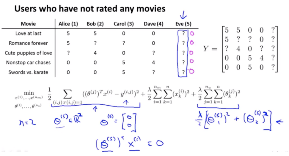 어떤 영화도 평가하지 않은 새로운 유저가 있다고 가정합시다. 변수의 개수는 n=2입니다. 이 유저는 아무런 평가를 하지 않았기 때문에 r(i,j) =1 인 항이 없고 따라서 0이 됩니다. 정규화 항의 경우에도 이미 파라미터가 0,0 이기 때문에 영향을 미치지 않습니다. Theta(5) = [0;0] 이기 때문에 알고리즘은 이브가 모든 영화에 0점을 줄 것이라고 예측하게 됩니다.