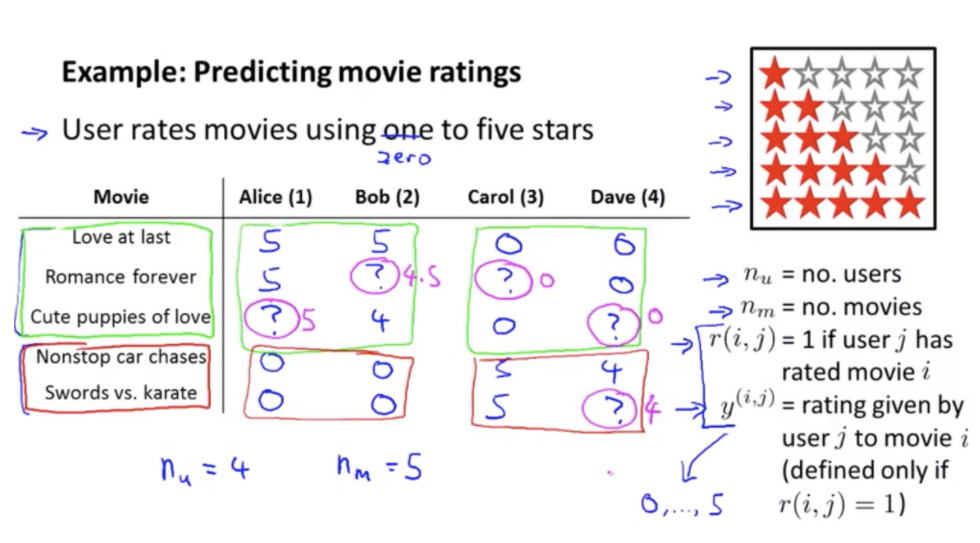 r(i,j)는 사용자 j가 영화 i에 별점을 주었는지 평가 여부입니다. 평가를 했다면 r(i,j) = 1, 아니라면 r(i,j) = 0 입니다. y^(i,j) 는 사용자 j가 영화 i에 준 평점입니다. 앨리스가 유저 1이고 Love at last가 영화 1이라면 y^(1,1) = 5 입니다. 추천 시스템 문제는 유저가 아직 평가하지 않은 영화에 어떤 별점을 줄 지 예측하는 것 입니다. 앨리스는 로맨틱 영화를 좋아하니 Cute puppies of love에 높은 점수를 줄 것이라고 생각할 수 있습니다. 데이브는 액션 영화를 선호하니 Swords vs. karate에 높은 점수를 줄 것이라고 예측할 수 있습니다. 이런 예측에 근거하여 유저가 더 좋아할만한 영화를 추천하는 것이 알고리즘의 목적입니다.