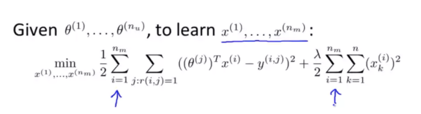 우리는 이미 유저들의 선호도인 파라미터 theta를 가지고 있기 때문에 각 영화들의 변수인 x만 최소화하면 됩니다. 컨텐츠 기반 추천처럼 실제로 사용자가 준 별점과 예상 별점의 오차의 제곱항을 모두 더하고 정규화 항과 함께 최소화합니다. 이렇게 모든 영화의 변수를 최적화합니다.