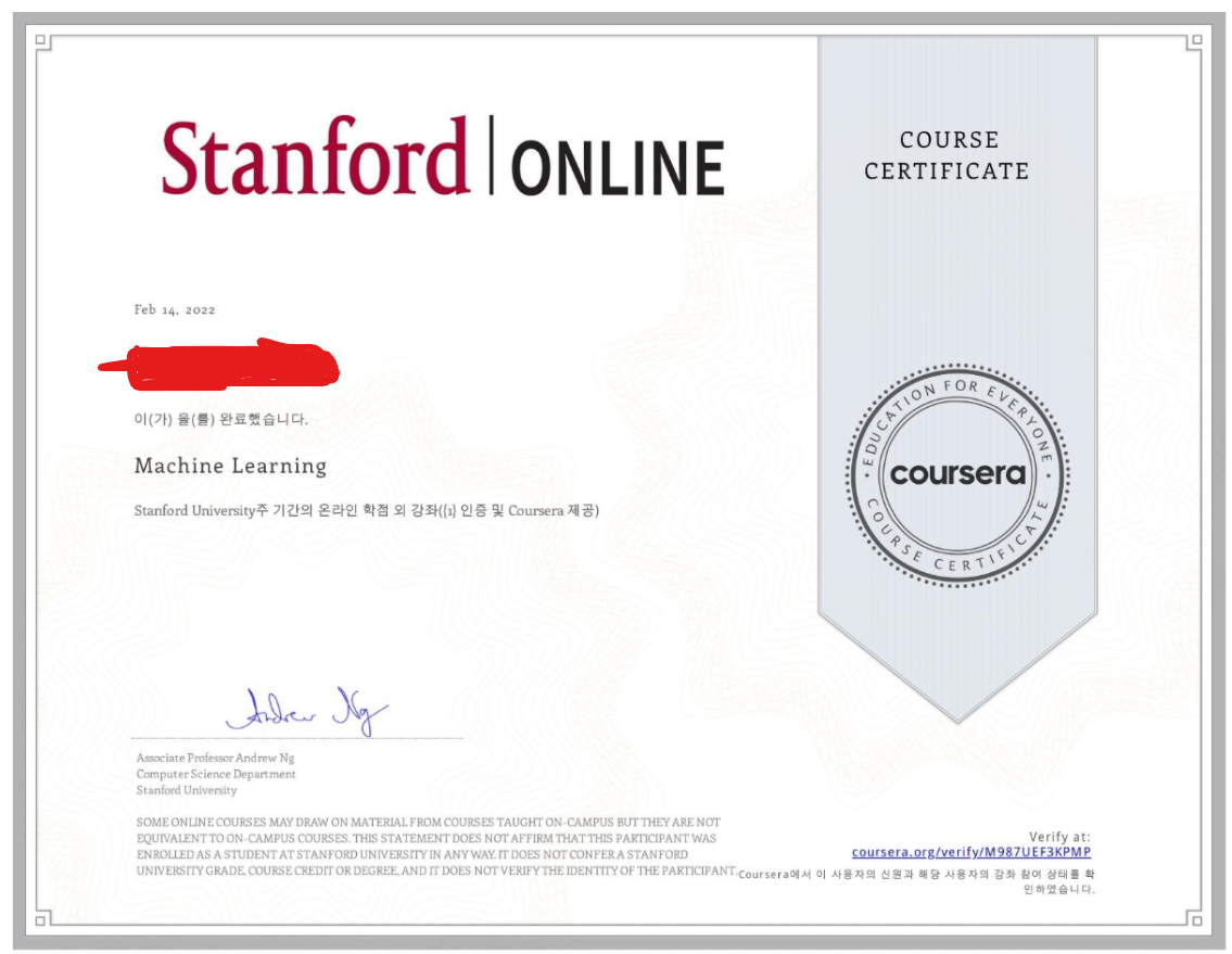 이 강의를 통해 머신 러닝이 무엇인지를 알게 되었고 이 쪽 분야에 입문할 수 있게 되었다. 사실, 더 큰 꿈을 갖게 도와준 강의라고 할 수 있다. 살면서 지금까지 했던 공부중에 가장 흥미롭고 재미있었다. 오랜만에 열정을 불태웠다 ㅎㅎ 앞으로 이쪽으로 더 깊게 공부하고 성장하려는 욕구가 솟아오른다.