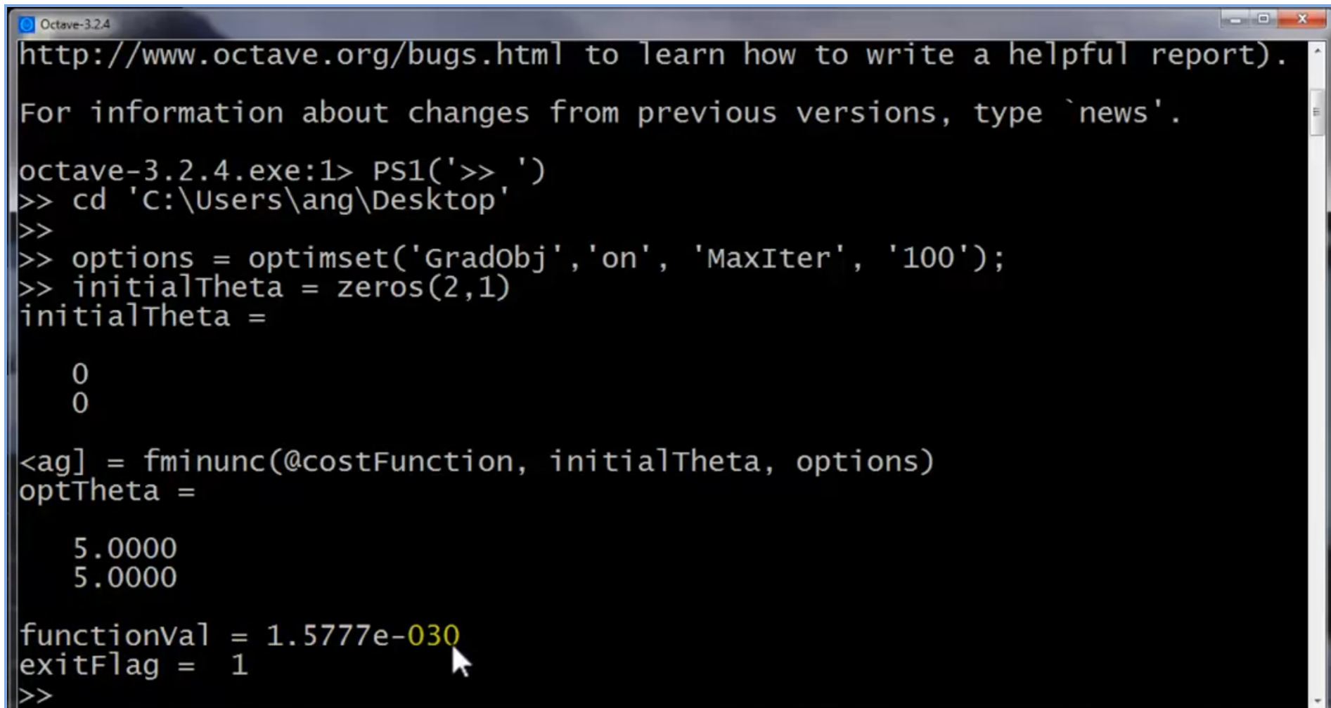 옥타브에서 구동시켜 보면 최적화 파라미터 optTheta와 최솟값 functionVal을 반환하는 것을 볼 수 있습니다. exitFlag는 알고리즘이 최적 값에 수렴되었는지 여부를 알려줍니다.