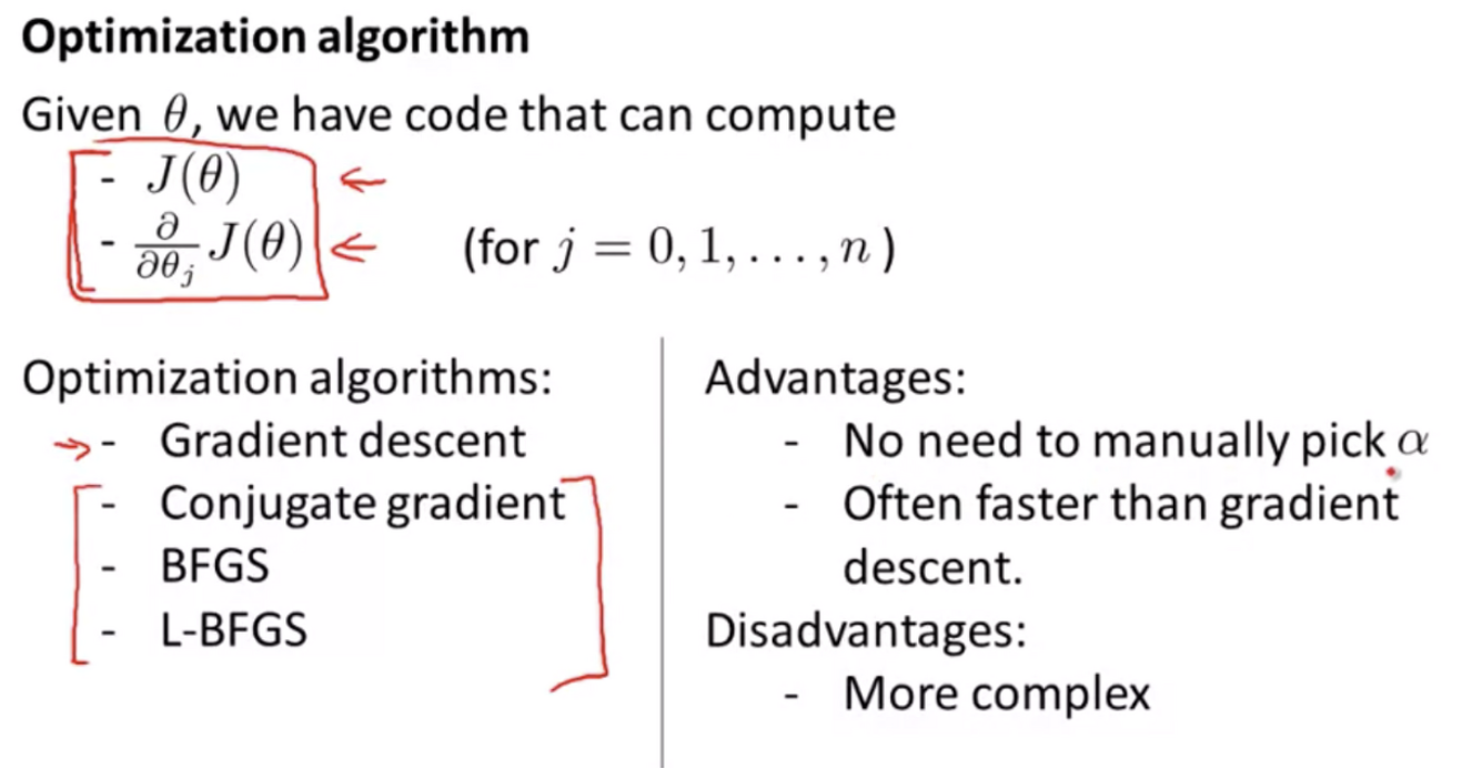 단점은 복잡하다는 것입니다. 다만 라이브러리 등에 구현되어 있어 우리가 직접 증명하거나 구현할 필요는 없습니다. 옥타브에서 고급 최적화 알고리즘을 사용하는 법을 배우면 됩니다.