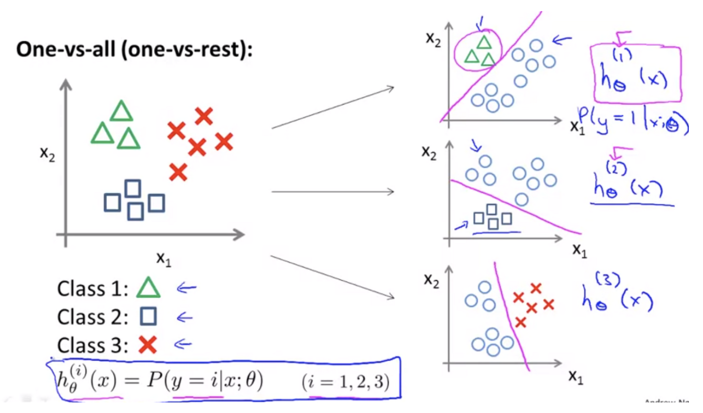 Class가 두개였을 경우 명확하게 Decision boundary를 구하기 쉬웠지만 복수개가 되면 어려워집니다. 따라서 멀티 클래스 문제를 여러 개의 이진 분류 문제로 전환합니다. 위 그림의 경우 클래스가 3개이므로 가설 함수를 3개 만듭니다. 새로운 입력값이 들어오면 모든 가설 함수를 실행하고 확률이 가장 높게 나온 클래스를 선택합니다.